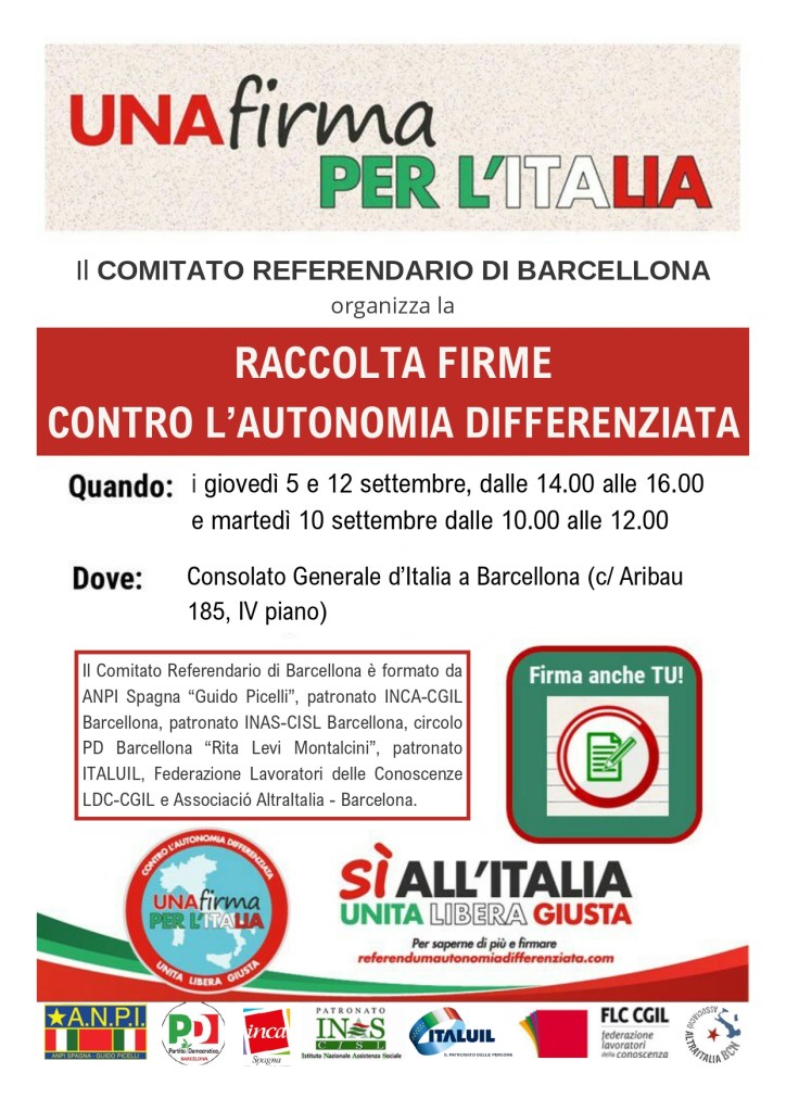 Il Comitato Referendario di Barcellona – formato da ANPI Spagna, Patronato INCA CGIL Barcellona, Patronato INAS CISL Barcellona, Patronato ITALUIL, Federazione Lavoratori delle Conoscenze (FLC-CGIL), Circolo PD Barcellona “Rita Levi Montalcini” e Associació AltraItalia-Barcelona – annuncia che anche nella nostra città sarà possibile, per le cittadine ed i cittadini italiani residenti in Spagna (circoscrizione consolare di Barcellona), firmare per promuovere il referendum contro l’autonomia differenziata, così come centinaia di migliaia di altre persone stanno già facendo in tutta Italia da quando è iniziata la campagna di raccolta firme, lo scorso 26 luglio.